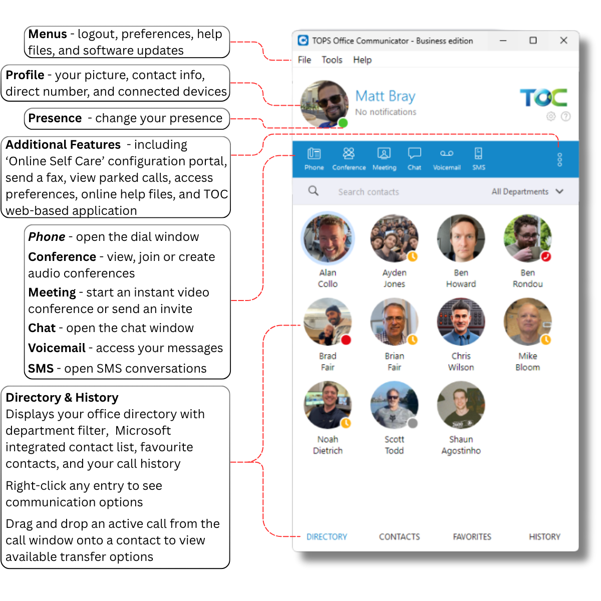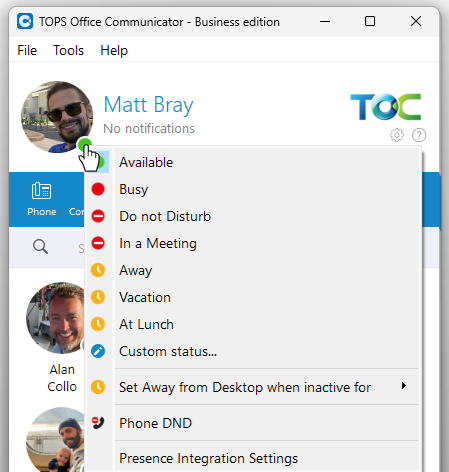 Show your availability to all TOC desktop and mobile users in your company by setting your presence. You can set your presence from any TOC app, and you can sync it with your Outlook or Microsoft Teams calendar. Custom rules can reroute your calls based on your presence status.
