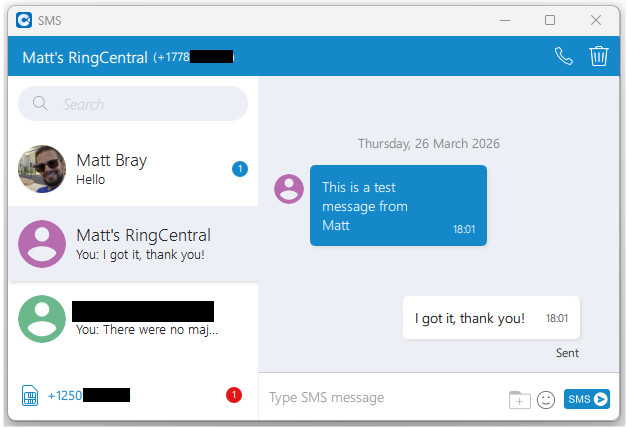 SMS allows you to send and receive SMS text messages and MMS picture messages to any cellphone number in Canada. All messages are sent and received through your direct phone number which is visible at the bottom left.