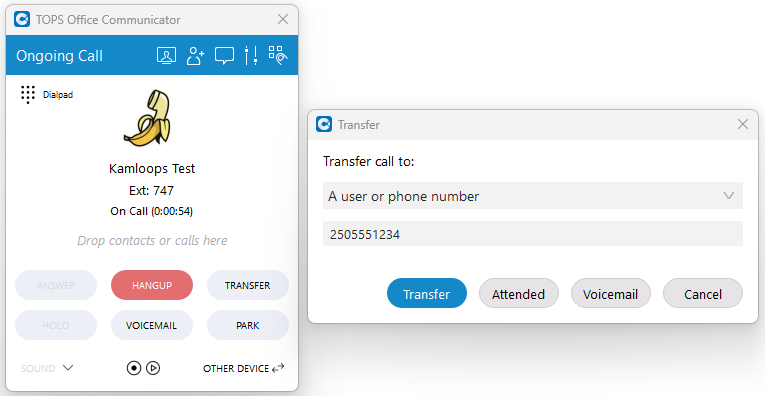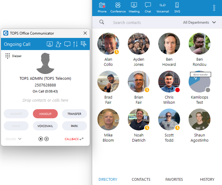 - Blind, Attended, and Voicemail transfer options are displayed when you hover over the contact entry.