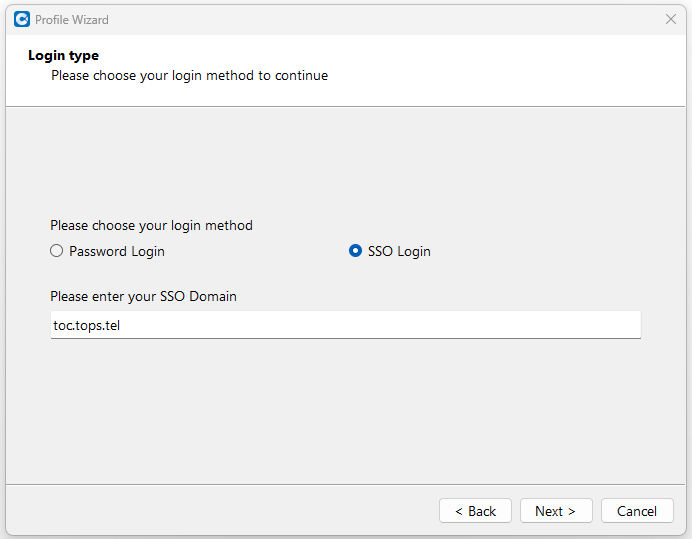 If you select SSO login, you will be prompted to enter the SSO domain: