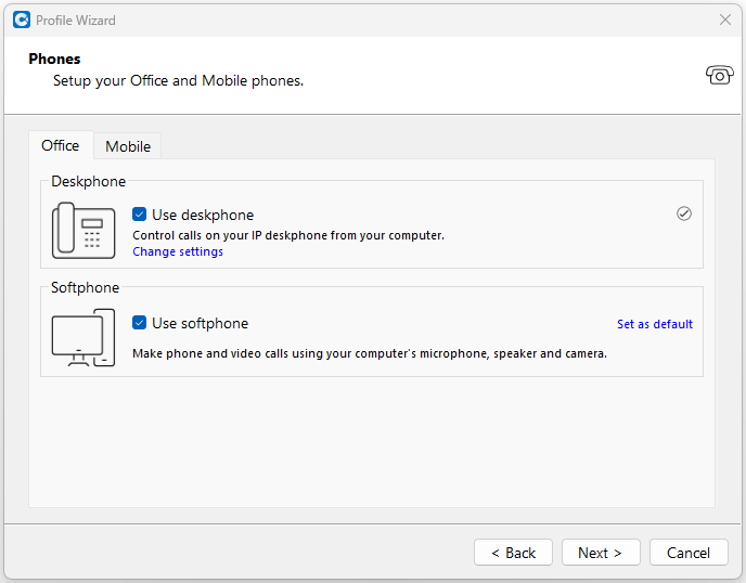 In the Phone window, or in Preferences, you can change your default calling device from your desk phone to softphone or mobile.