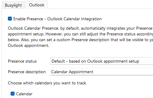 Presence status - select whether to follow the settings in your Outlook calendar appointment or always apply the same Presence during calendar events.