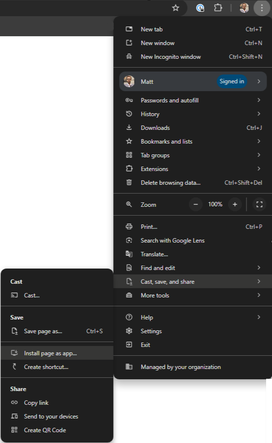Once you are logged in, click on the vertical ellipsis on the top right corner of the window, go to Cast, save, and share and select Install page as app...