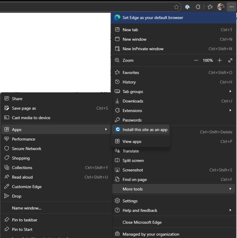 Once you are logged in, click on the ellipsis at the top right, go to More tools, Apps, and select Install this site as an app.