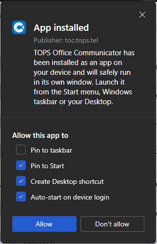 Press Install on the popup, and when a new window opens, select Pin to Start, Create Desktop shortcut and Auto-start on device login.