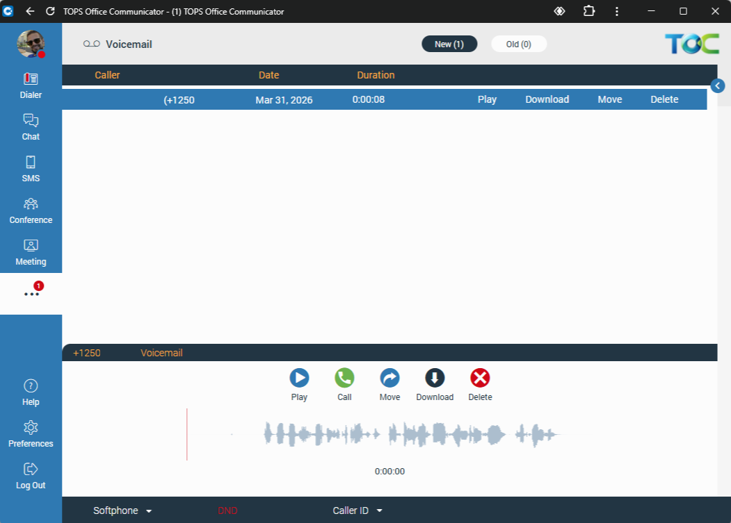Click on a message to show the Play, Call, Move, Download, and Delete buttons.