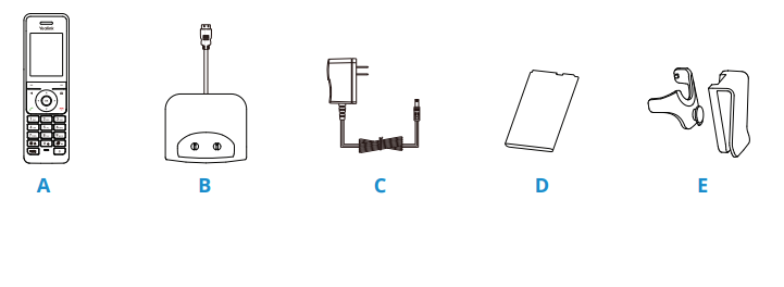 - Open the box and remove the Handset, Power Adapter, Batteries, Belt Clip and Charging Cradle.